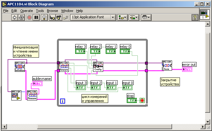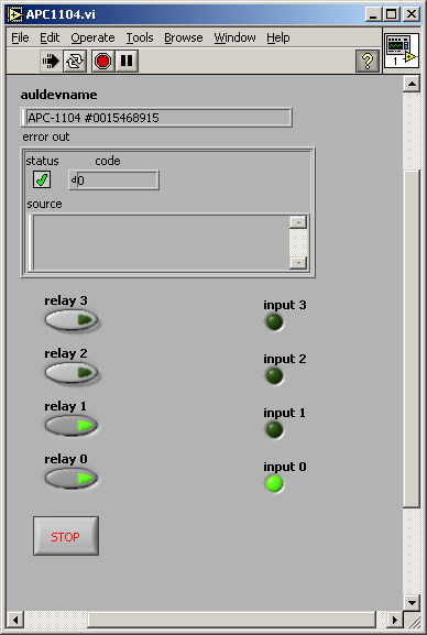 Палитра функций (APC1104.llb), структура меню (APC1104_xx.mnu) и пример инструмента (APC1104 example.vi) для LabVIEW. Позволяют использовать модуль в среде графического программирования LabVIEW. Пример инструмента реализует только базовые возможности прибора (идентификация, чтение состояния и управление выходами).