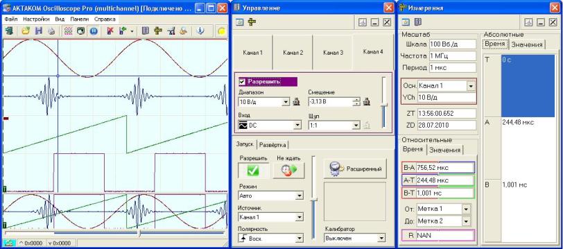 Поддерживается как режим цифрового осциллографа с последовательным сбором осциллограмм ограниченной длины, так и режим самописца с непрерывным сбором и отображением данных неограниченное время.