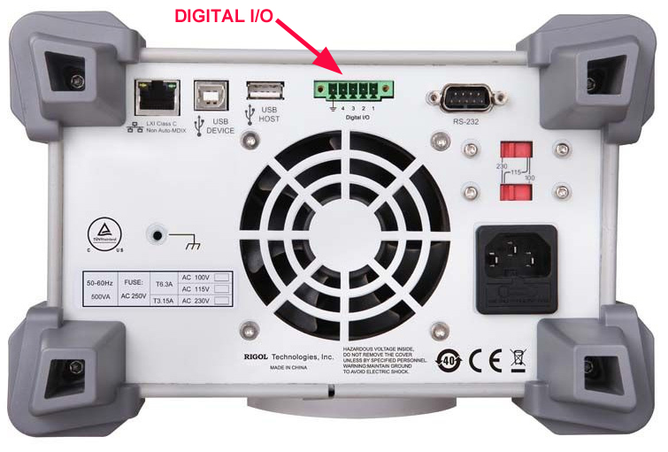 Опция DIGITALIO-DP800 (DP8-DIGITAL-IO) предназначена для программируемых источников питания Rigol серии DP800: DP832, DP831, DP821, DP811 и др. без индекса "A" в названии модели. Опция активируется программным ключом. На задней панели прибора установлен разъем соединителя.