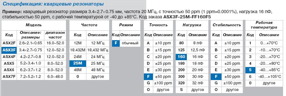 Спецификация кварцевых резонаторов возможных к заказу и пример формирования заказа: