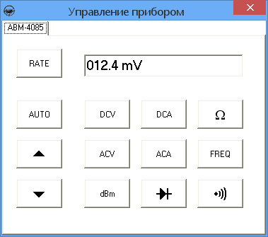 Окно "Управление прибором" перехватывает управление с панели управления мультиметра АВМ-4085, что позволяет дистанционно задавать режимы измерения. При этом ручное управление прибором недоступно.