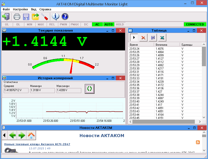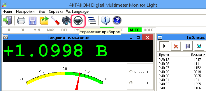 Программное обеспечение Aktakom DMM Light реализует отображение текущего значения и истории измерений в виде таблицы и графика с определением максимального, минимального и среднего значений, обработки и сохранения в файлы данных на ПК.