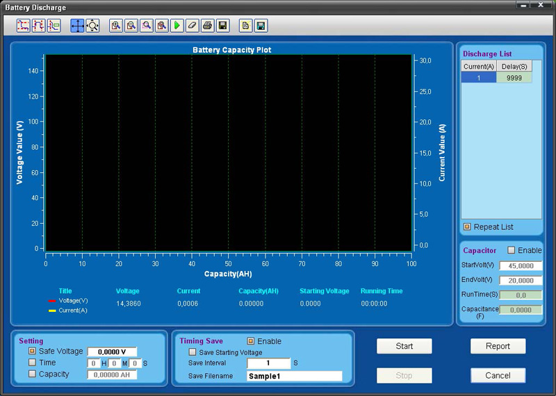 Программа предоставляет широкие возможности по тестированию и определению параметров батарей. Данные тестирования могут быть проанализированы, сохранены в файл распечатаны на принтере.