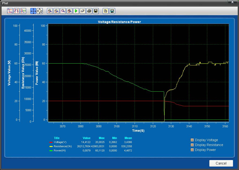 | Индикация | Отображаются текущие значения измерений напряжения, тока, сопротивления и мощности, выводятся на график, график настраивается | Отображаются текущие значения измерений напряжения, тока, сопротивления и мощности, выводятся на график, график настраивается |