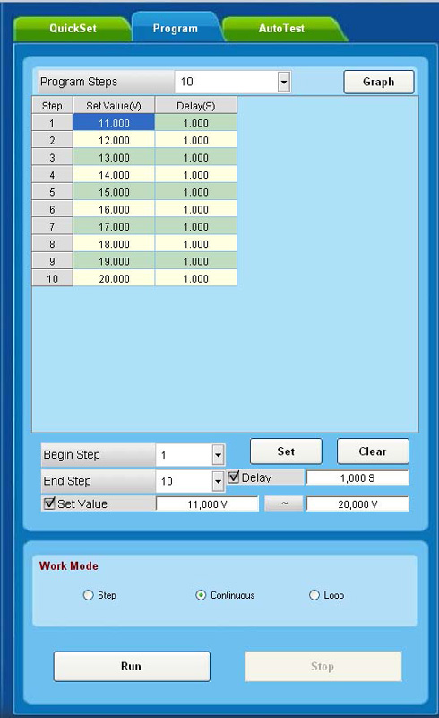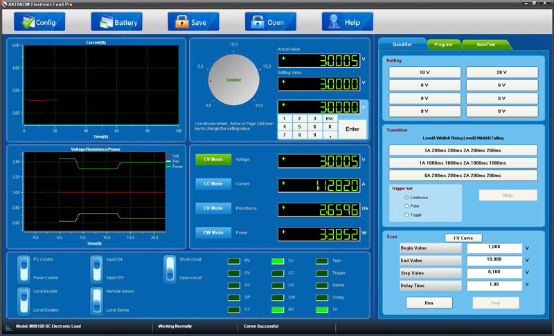 Программное обеспечение AELPro предлагает широкие возможности по управлению входным напряжением, током, сопротивлением, мощностью как в произвольном (ручном), так и в функциональном режиме. Функциональное управление является мощным инструментом программы AELPro, позволяющим не только автоматически управлять прибором с помощью компьютера, но и программировать его на режим автономной работы по заранее заданному алгоритму. Режим функционального управления в AELPro позволяет автоматически управлять входными параметрами (напряжение, ток, сопротивление, мощность) электронной нагрузки.