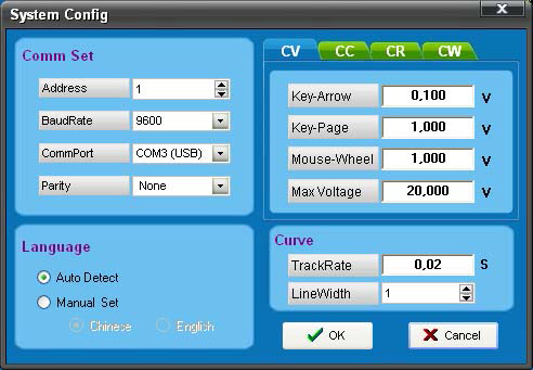 Окно, в котором задаются параметры подключения и некоторые настройки программы. При подключении необходимо указать адрес нагрузки, скорость обмена данными, COM-порт и паритет.